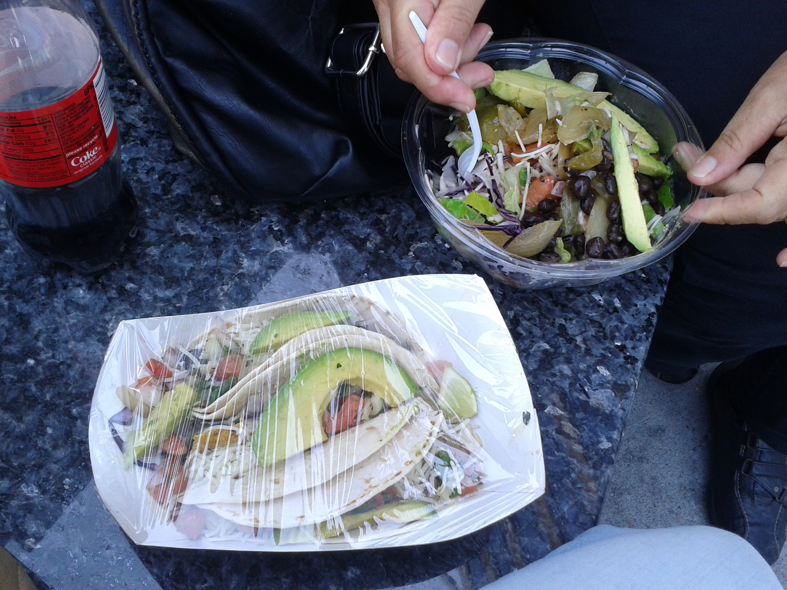 First some salad with grilled vegetables. The salad was amazing fresh made and the vegetables were still hot when we got the salad. And lots of avocado. Very goooood.
