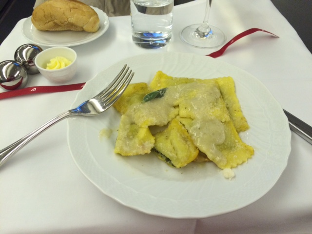 Spinach and gorgonzola filled ravioli served together with a cream sauce. It was allover ok. I assume that it is quite difficult to serve fresh pasta flying 13-15 km up in the air.
