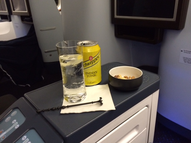 Just after take off a small aperitif. Gin Tonic and some nuts.