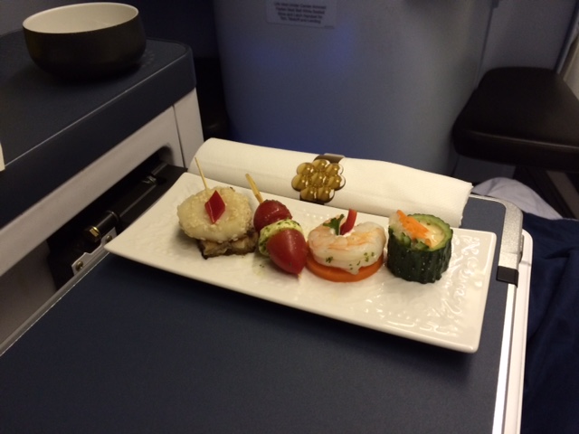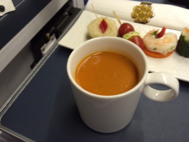 As I did not want to go for the complete menu, du to the fact that the flight departed after 11pm, I selected the “Quick Option”: A cup of tamato soup together with some European styled snacks. Cucumber filler with cheese cream, shrimp served on tomato, tomato-mozzarella stick with pesto and sesame covered stemed fish. Very nice alltogether and not heavy on the belly.