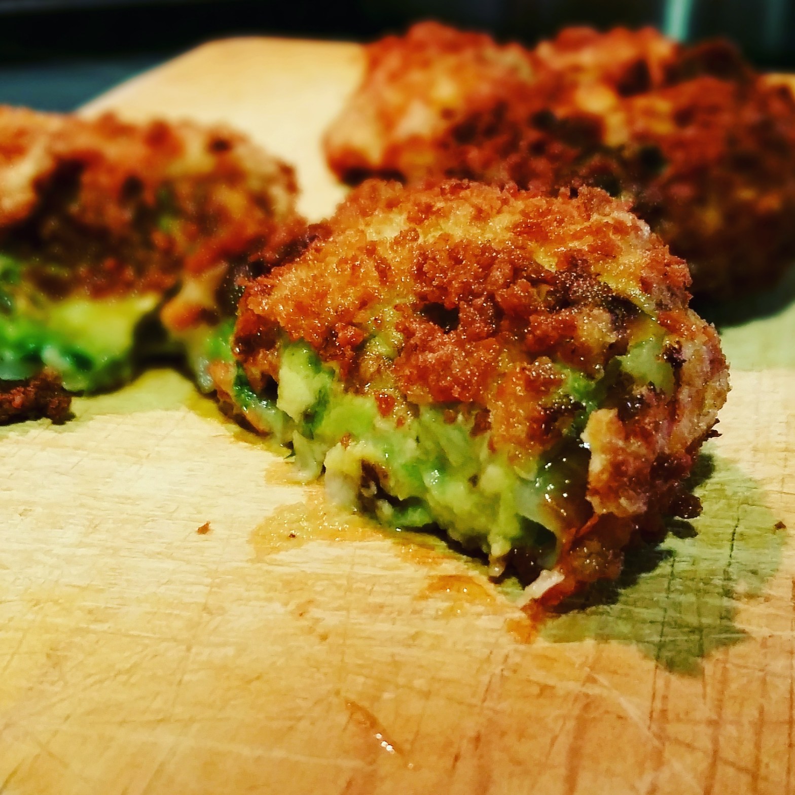 Peel the onions. Cut every onion in three thick slices. Pick out the rings and spread them out over a tray that previously has been covered by transparent foil. Fill the onion rings with the guacamole and freeze them for at least 4 – 5 hour. Once the filled onion rings are hard enough. batter them first in the flour, then in the scrambled eggs and finish by winding them in the bread crumbs. Deep-fry them in very hot oil for a few minutes.