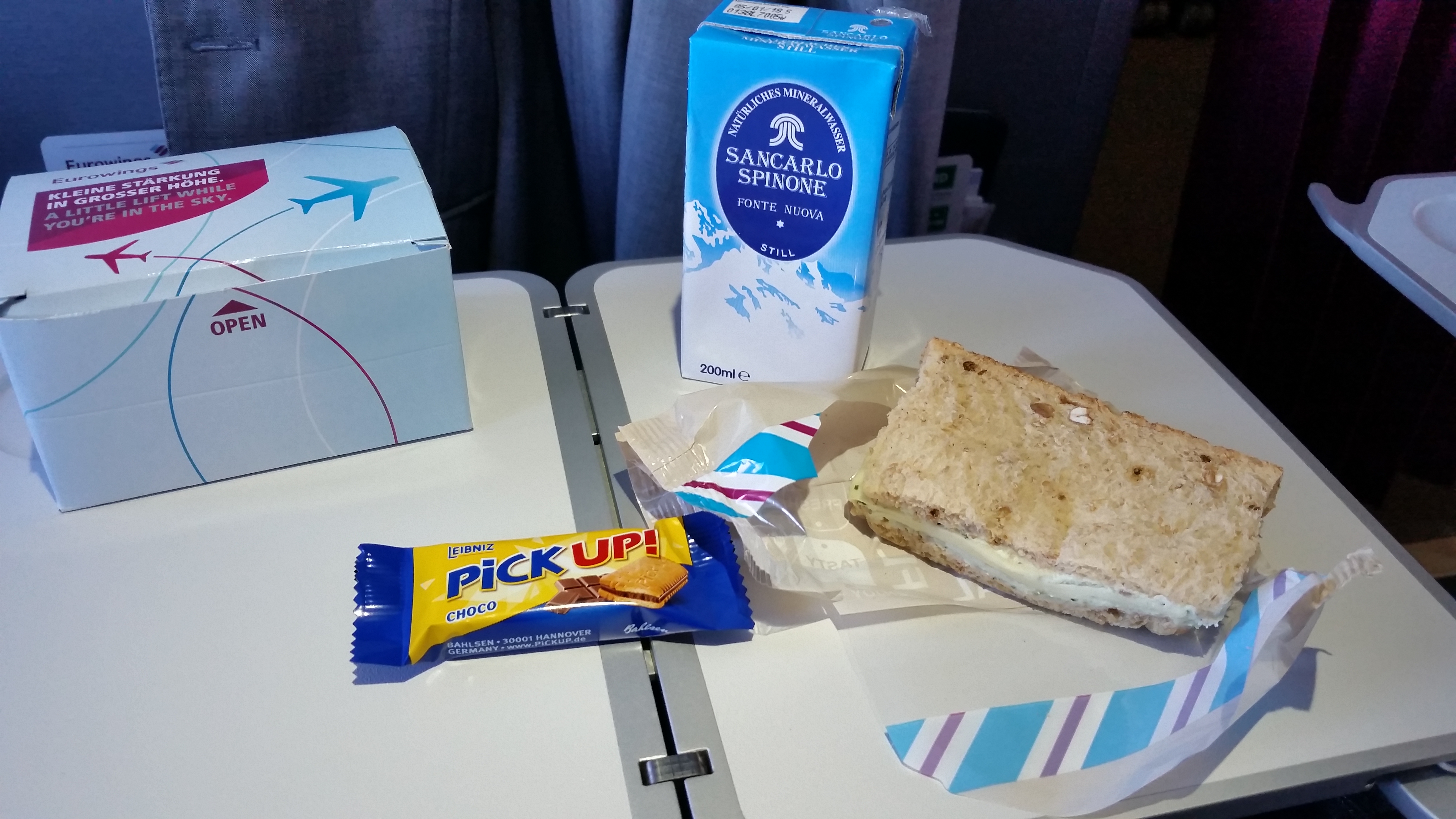 Usually you are not supposed to get food on a low cost Airline. Well…flying Eurowings, the Lufthansa lowcost, with a SMART tariff gets you a small snackbox a free complimentary drink.