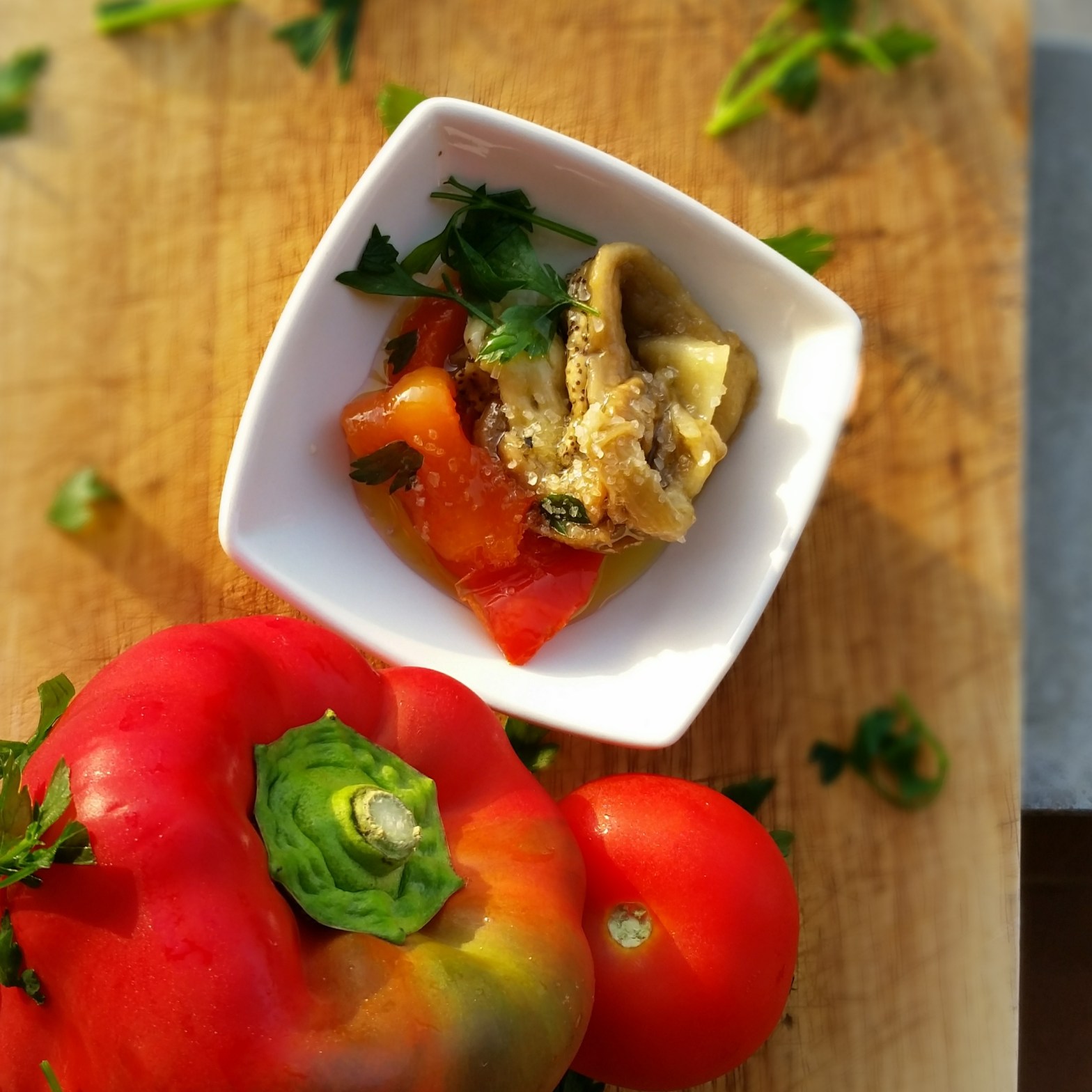Take the veggies out and let them cool down. Once they are cold peel then and remove the seeds. Mince or cut in small stripes and place them on a plate. Season with oil and salt (if you like add a few drops of vinegar.