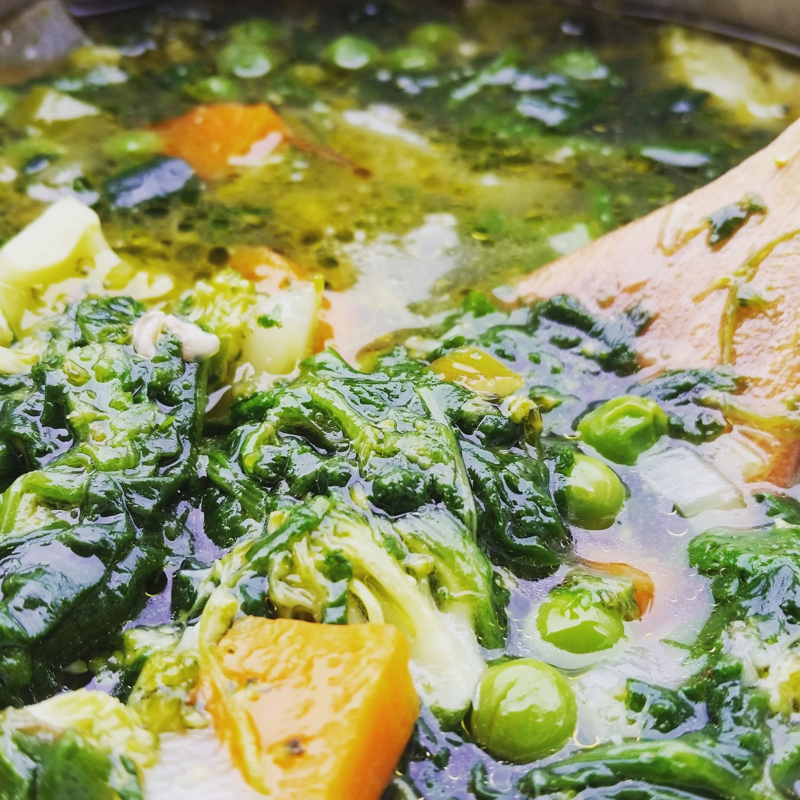 Start by heating up the olive oil in a large pot. Roast carrots, porridge, and onions. Add the rest of vegetables and roast for a couple more minutes. Cover with the vegetable broth. Cook for 15-20 minutes approx. Season with salt and pepper.
