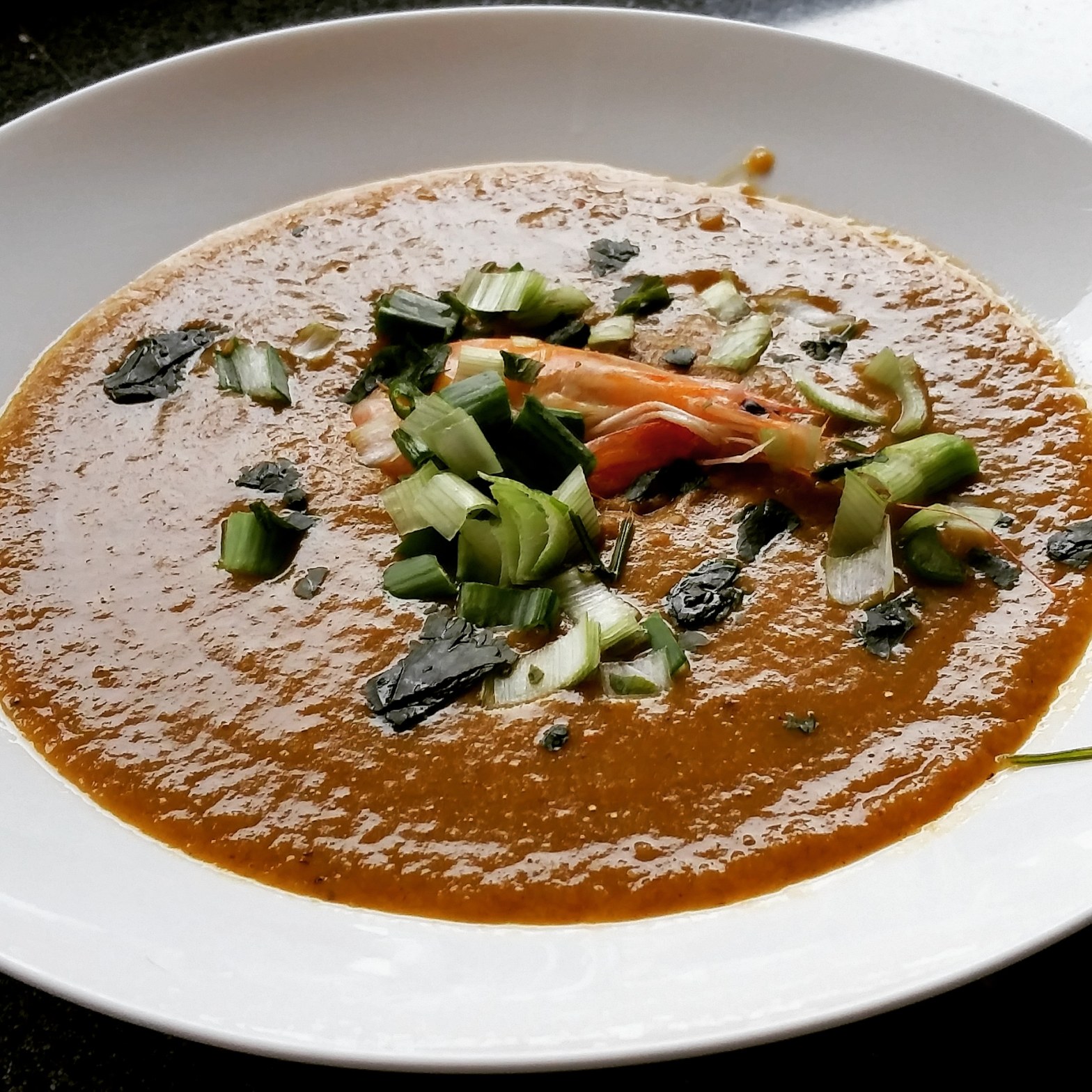 Heat up the oil in a pan. Chop the onion, bell pepper, and garlic and roast the in the oil. Peel the shrimps. Dice Shrimps, squid, and mussles. Add them to the pan and keep roasting for a couple of minutes. Season wih salt and pepper. (If you want some extra spicy kick use cayenne pepper instead of regular pepper). Cover with fish stock and boil for 10 minutes. Once everything is cooked well blend soup until you get a super creamy texture.