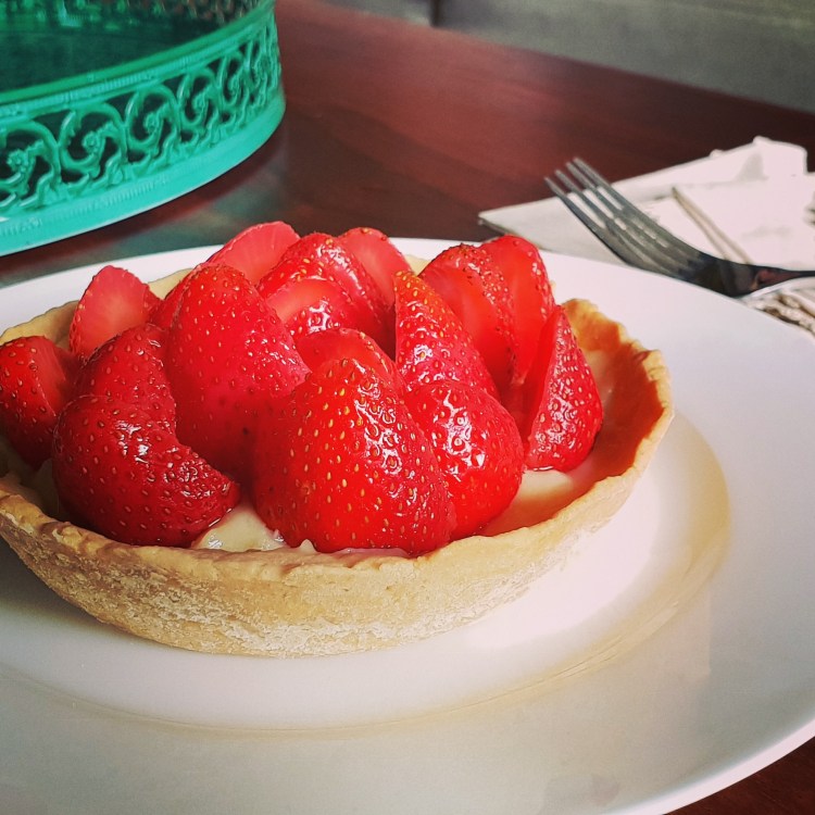 (In my variant I used a basic round cake form with a little bit of border. I filled the sablée with some light vanilla cream and decorated with some glazed strawberries)