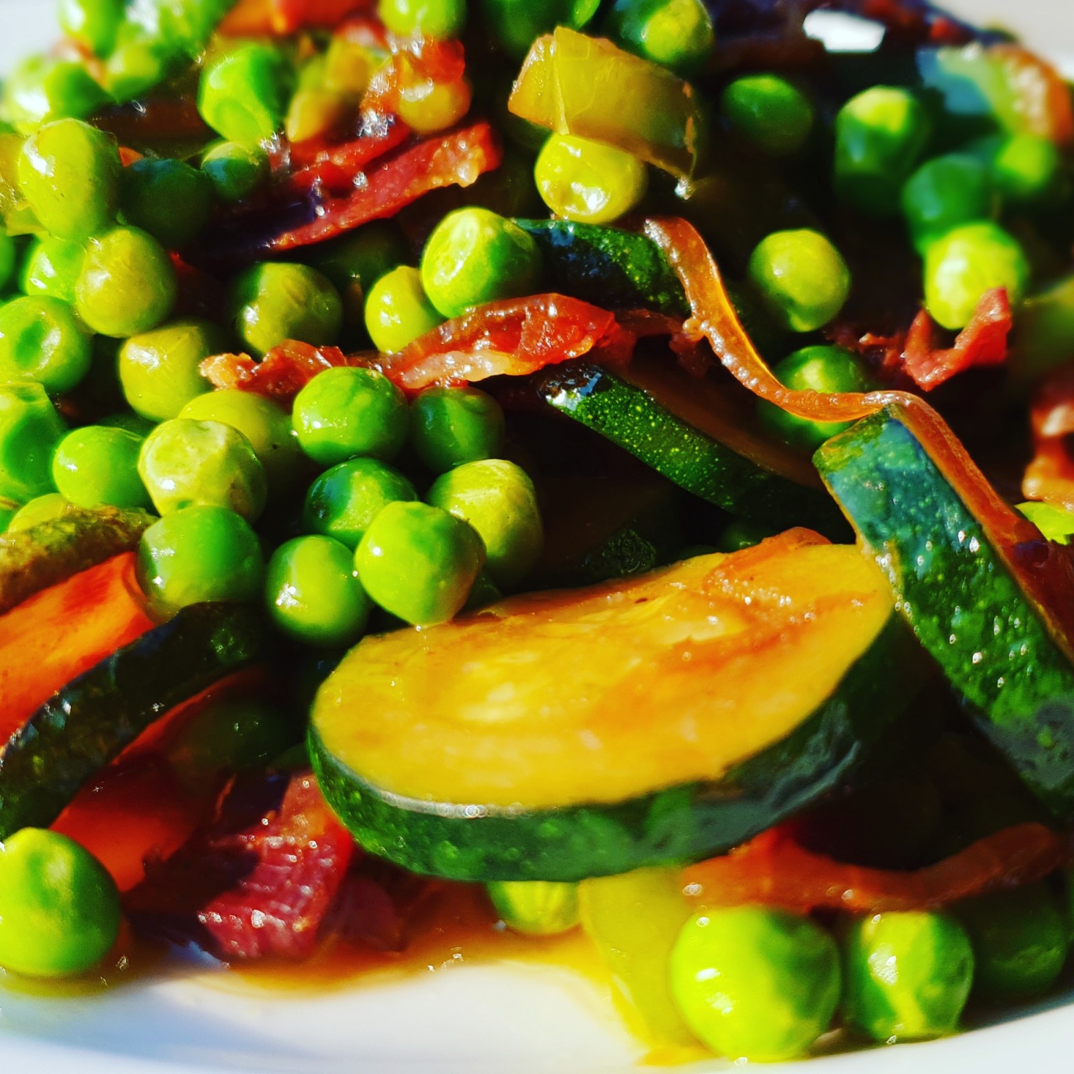 Heat up the oil in a pan. Roast the ham until it gets crispy. Slice the onion and zucchini and add both. Stir and roast for a 5 minutes. Add the peas and cool off the pan with the soy sauce.