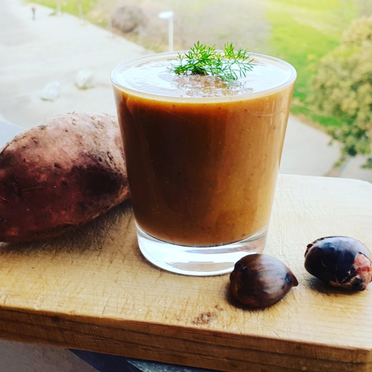 Peel and cut down chestnuts, carrots and sweet potato. Place them in a pot. Add the vegetable stock and some salt and pepper.