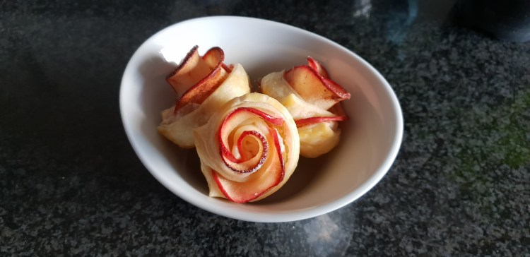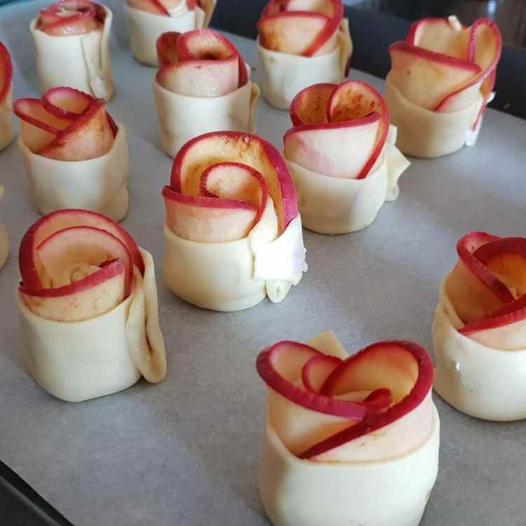 Cut the puff pastry in 8 equal stripes. Spread the cream cheese on the middle of each. Place apple slices on the upper part of each stripe. Each slice should cover half of the one placed before. Fold the lower part off puff pastry over the apple slice-half and roll it to a rose.
