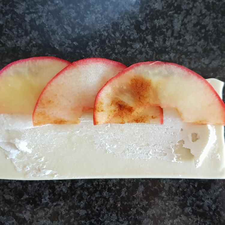 Cut the apple in two halves. with a spoon get rid of the appleseeds. Cut the apple halves in thin stripes. Put the stripes in a bowl and cover them with cinnamon and lemon juice. Cook the halves in the microwave for 2 minutes to get them soft.