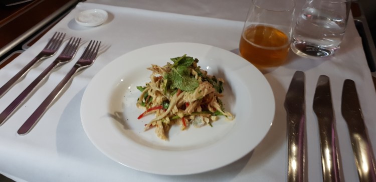After departure, as food was more or less a la carte, I went for three differnt dishes. First up was some coconut milk chicken salad with cashews, chilli and lemongrass.