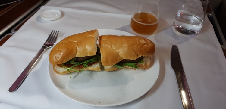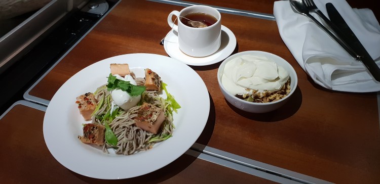 Just before landing I went for some savoury breakfast. Smoked salmon on buckwheat noodles, koriander, zucchini, and poached eggSummary: