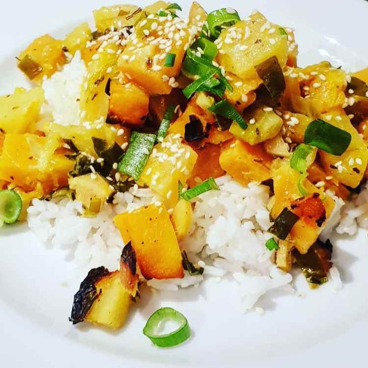 Peel and chop garlic, onions, and ginger. Peel and cube sweet potato and pumpkin. Mix all veggies together and season with oil, spices and lime juice (extracted from the lime) Let the mix rest for 30 minutes
