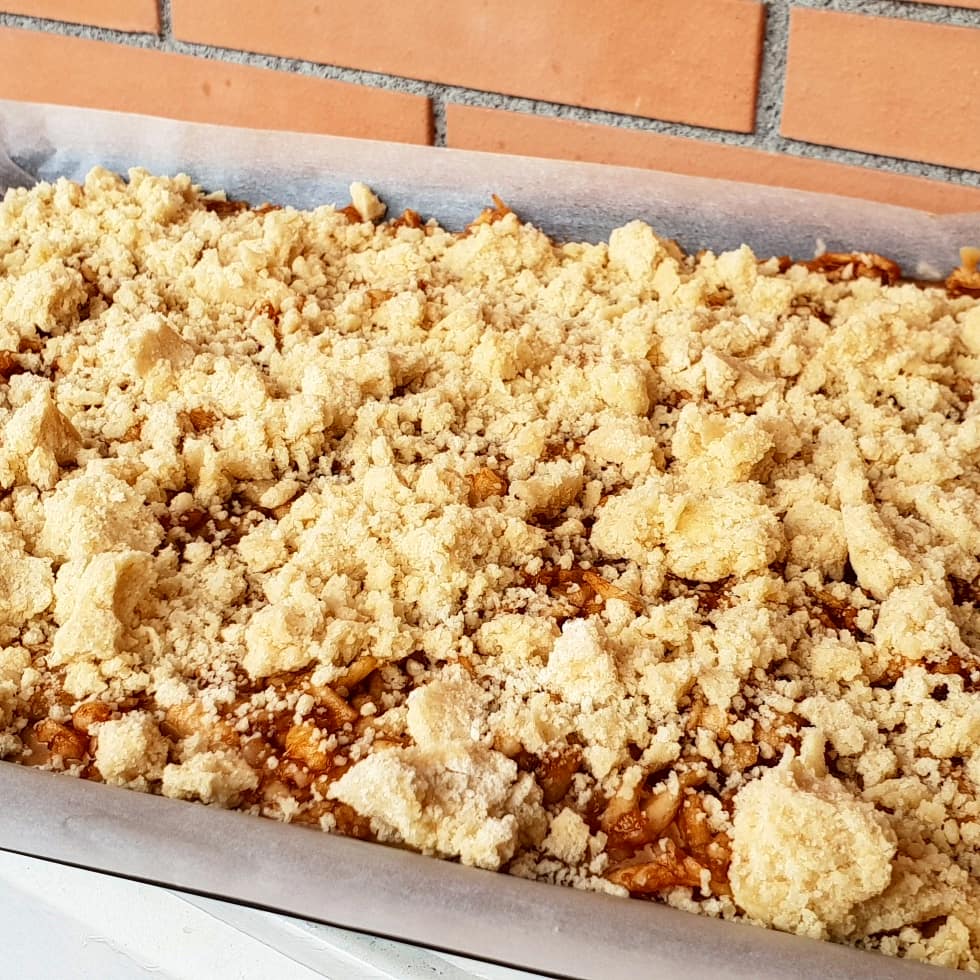Spread the batter on a recangular large form. Cover with pears and some “Streusel”.