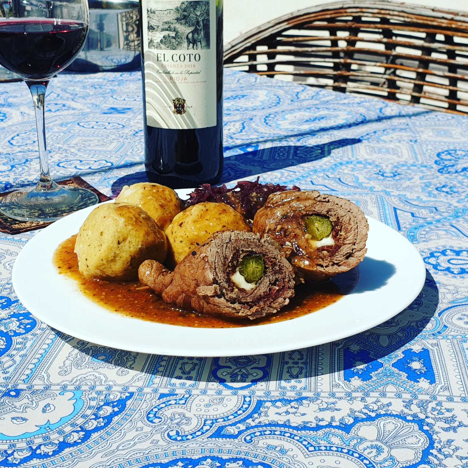 Heat up some oil in a pot. Roast the Roulade for aprox 2 minutes. Then cover with the wine. Add bay leaf and rosemary and let the roulade cook on low temperature for aprox 45 minutes.