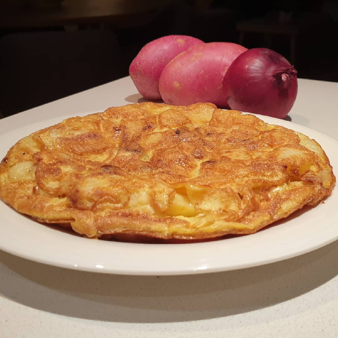 A classic potato pancake or omelette served in almost every Spanish bar. Either served as a side, on bread as a sandwich, or just by itself. This one is gets never boring.